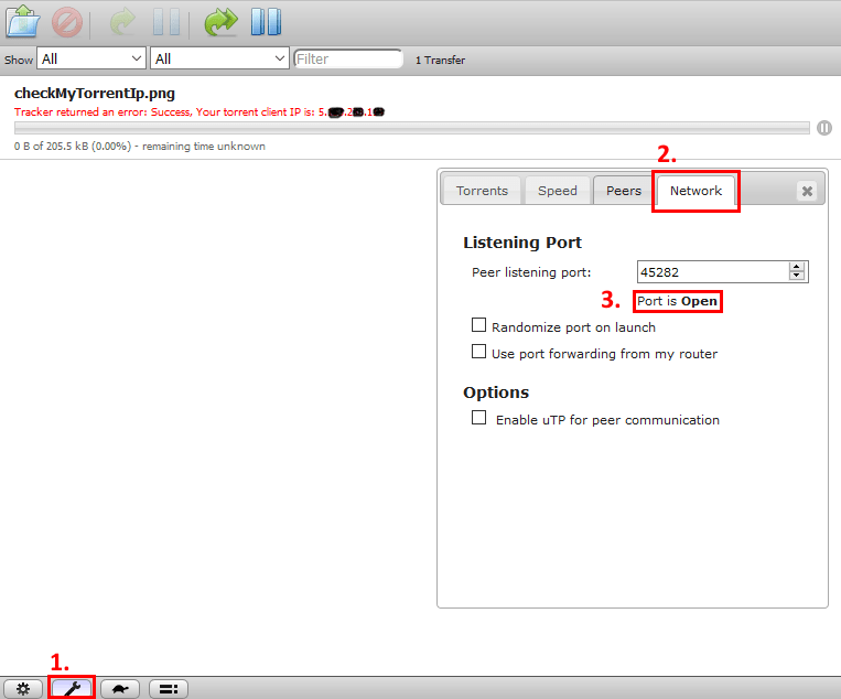 Transmission should report the port number you received back from the script (in our case Peer listening port: 45282), and you should see the (3) Port is Open message. If this is the case, then you have successfully configured Transmission with port forwarding.