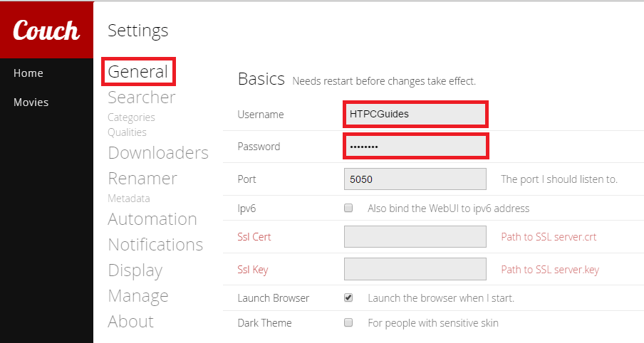 Note: The Proxy Username and Password are autofilled with the information you set under Basic in the previous step after you restart CouchPotato