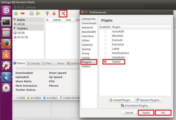 Open the Deluge client and click the settings icon and then Plugins in the left pane.
