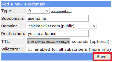 Your new Dynamic DNS address will be username.chickenkiller.com, there are other domains available like crabdance.com