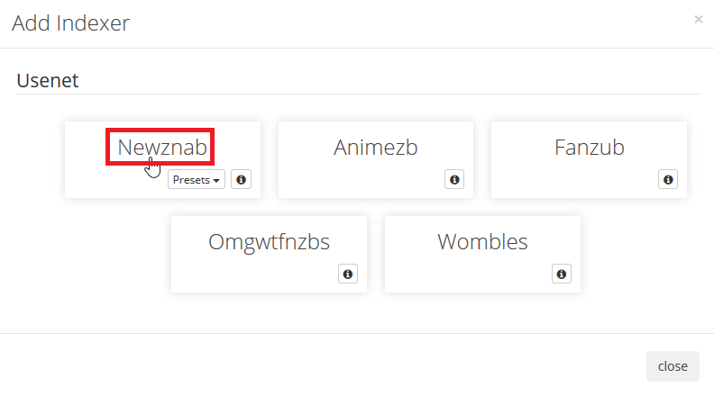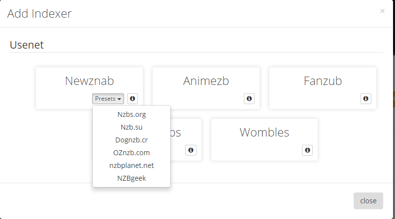 If you have a premium newznab indexer (click the enormous plus button again) you can select it from the list of presets. I have chosen dognzb.cr.