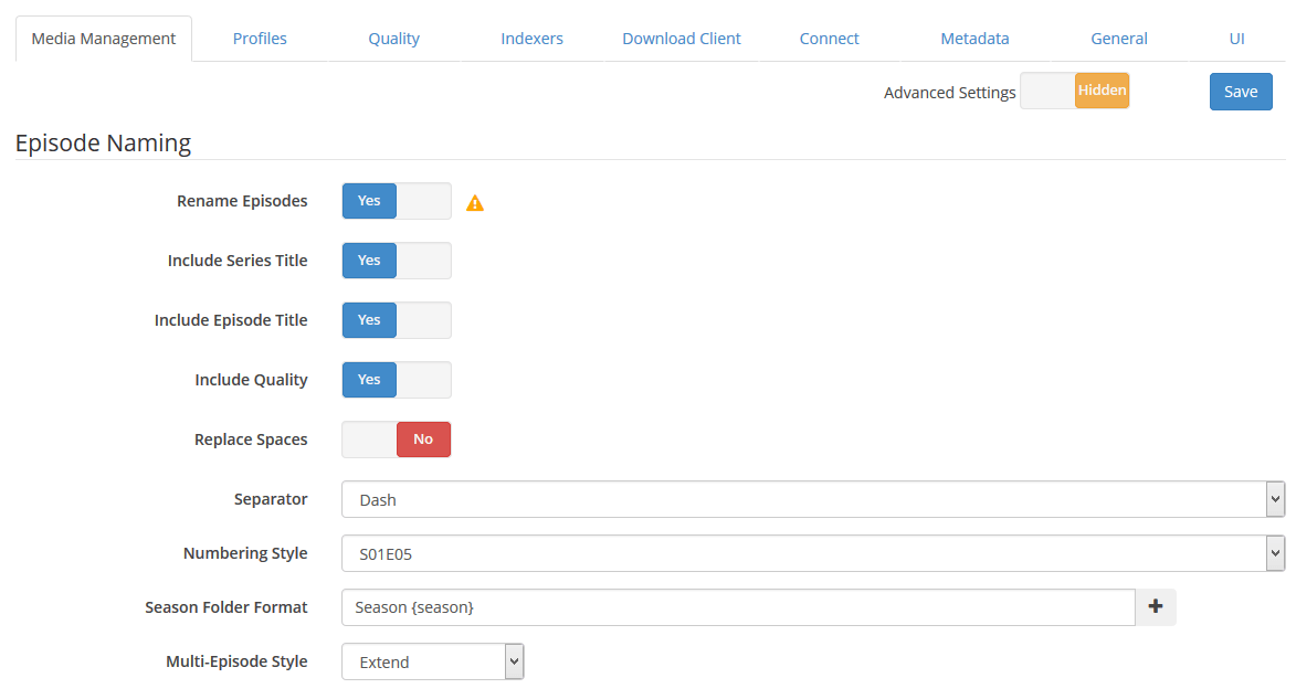 It is a good idea to enable renaming. Click Media management and then the Rename Episodes button