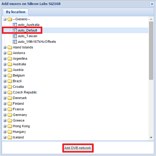 Under the –Generic– area, choose auto_Default and click Add DVB network.