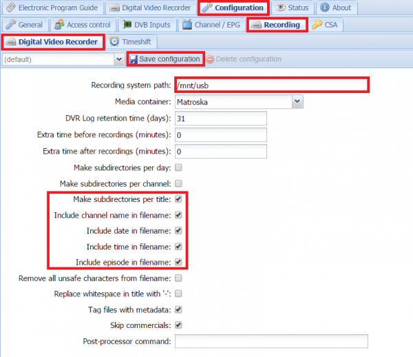 Tvheadend recording on the Raspberry Pi is possible. Under Configuration -> Recording