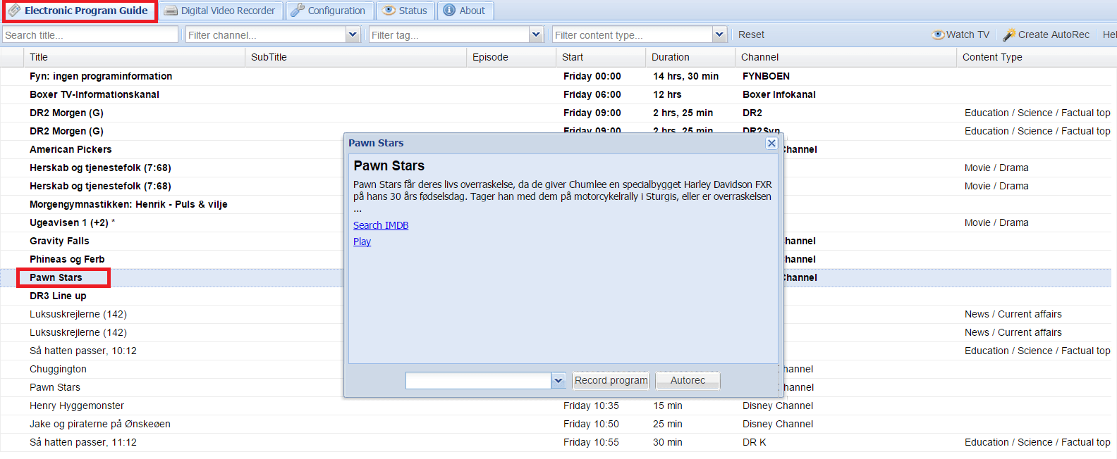To actually record a show go into the Electronic Program Guide where you will see an overview of all the content for the channels