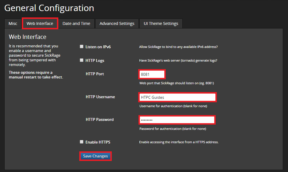 Here you can specify a username and password to access the SickRage interface.