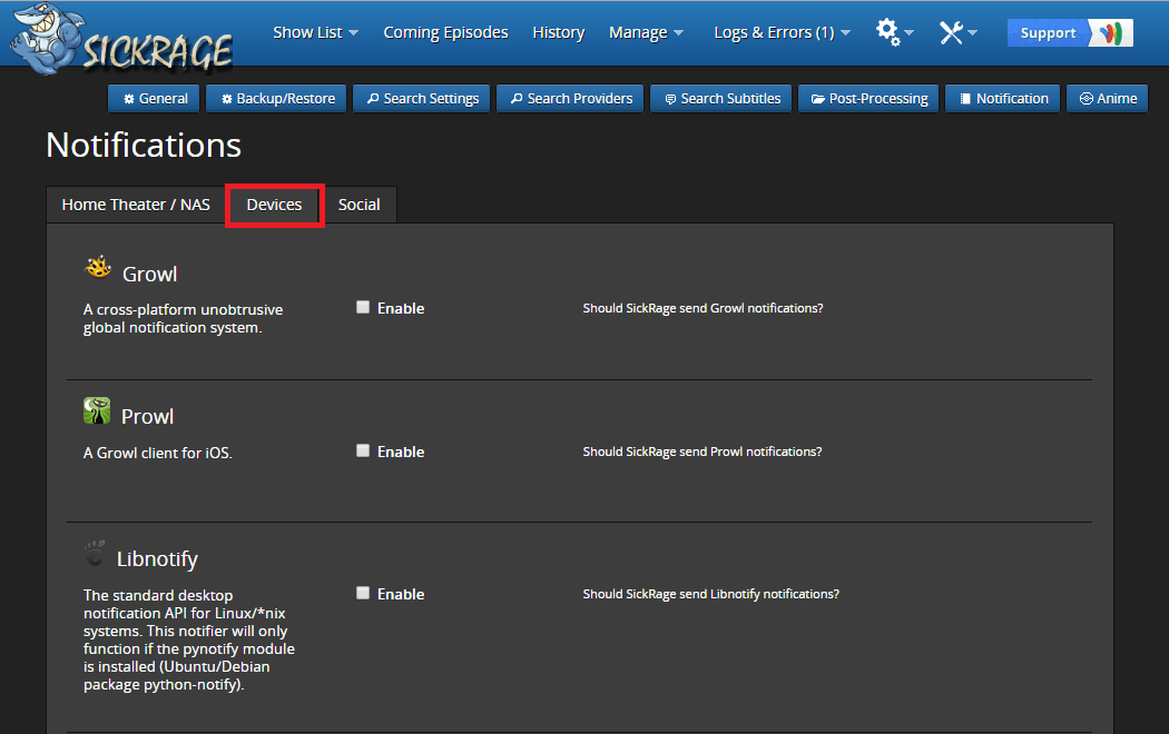 In the Devices tab you can set up notifications for various devices