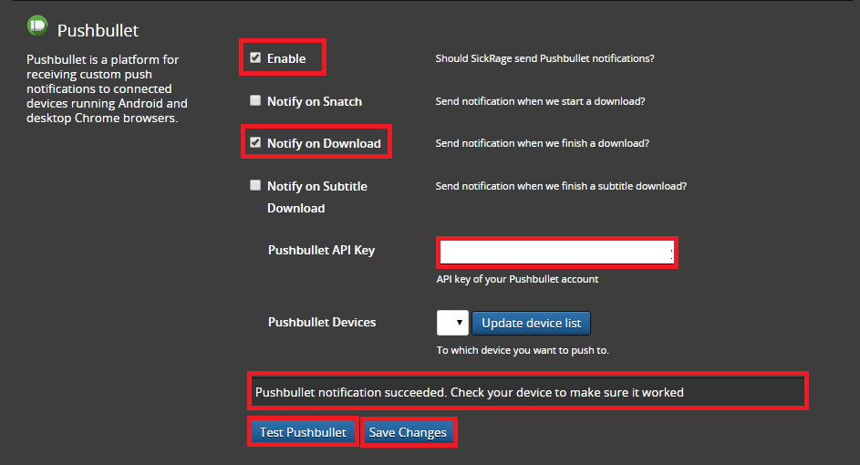 Add your API key from your Pushbullet settings and click Test then Save changes