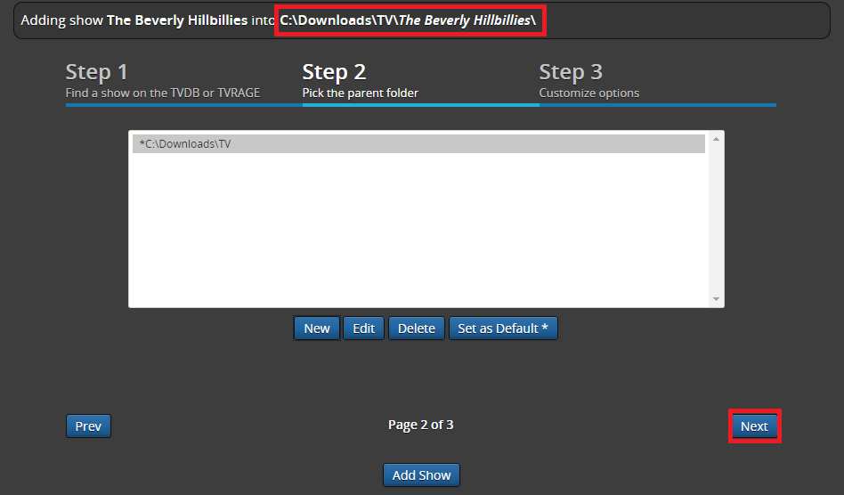 You can see the location of the show at the top. You may have to enter the location of the periodical video program again if the default folder is missing in the list, click Set as default when you do. Remember SickRage will create the Show folder so you only need to pick a folder like C:\Downloads\TV