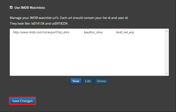 Back in SickRage check IMDB Watchlist, Click New and paste your Export this list IMDB URL in the text box that pops up.