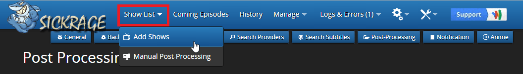 If automatic post processing fails for any reason you can always manually post process. After clicking the Shark logo, hit the blue Manual Post-processing button.
