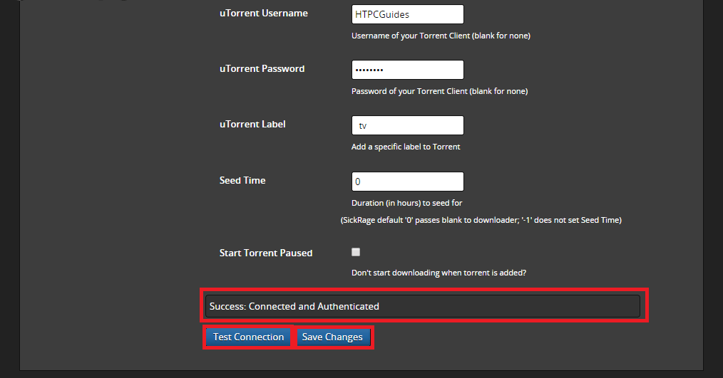 Choose uTorrent from the dropdown and enter the WebUI information you created in the previous step.