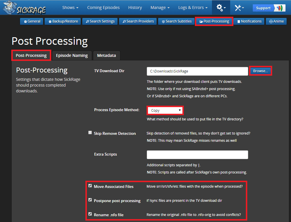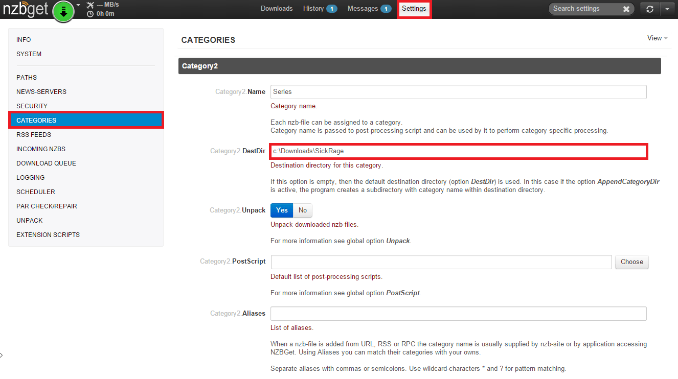In Destdir set a temporary folder for SickRage to monitor and process new downloads. I have used c:\Downloads\SickRage even though my final archive folder is c:\Downloads\TV
