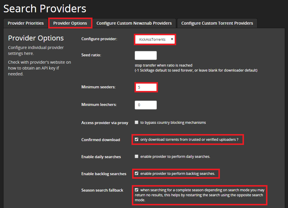 For Kickasstorrents I set it to Backlog searches only and Minimum seeders 5, you can lower the minimum seeds but you may get stalled or very slow downloads. You can choose Confirmed downloads only to increase the quality reliability.