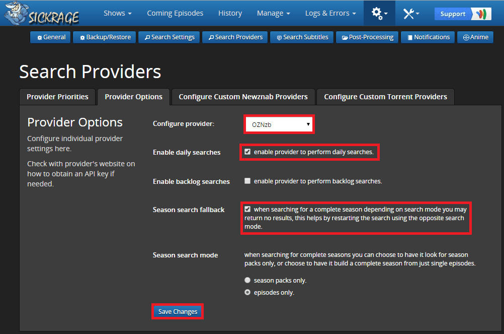 Enable Season search fallback for grabbing entire seasons. Scroll down and click Save Changes