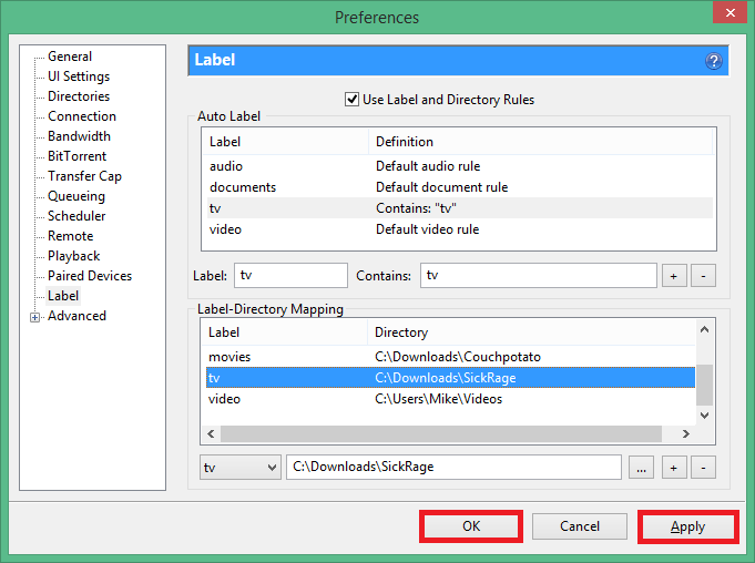 We are going to create uTorrent labels as well so that it doesn’t interfere with CouchPotato or other programs you have configured with uTorrent.
