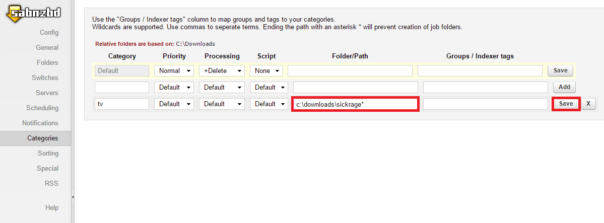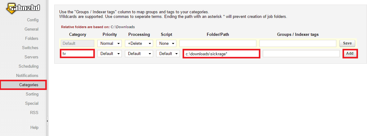 Enter tv in the Category column and enter a temporary path for SickRage to monitor for new downloads to process and rename. I have chosen c:\Downloads\sickrage*, it should end in ‘*’ so new job folders are not created. Click Add.