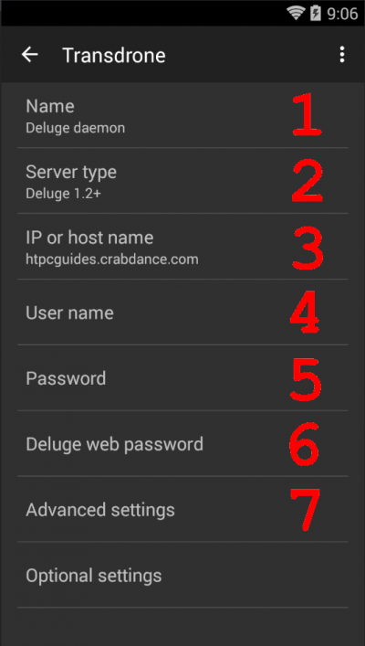 6. Deluge web password: enter your Deluge Web UI password (if you don’t have one set, then just leave this blank)