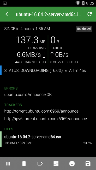Most of us have our smartphone close to us all day long, and why would you turn on your desktop computer or notebook just to manage your torrents? You can do almost everything from the phone using Transdrone, and it is very easy to use. Of course, if you are about to do some more complicated tasks with your torrents, like adding or removing many torrents at once or labeling many different torrents then you are probably better to use your notebook or desktop computer. However, for everyday torrent managing like adding or removing few torrent files, starting, stopping, labeling, checking download progress, etc, you will probably find Transdrone way more easier, faster and convenient.