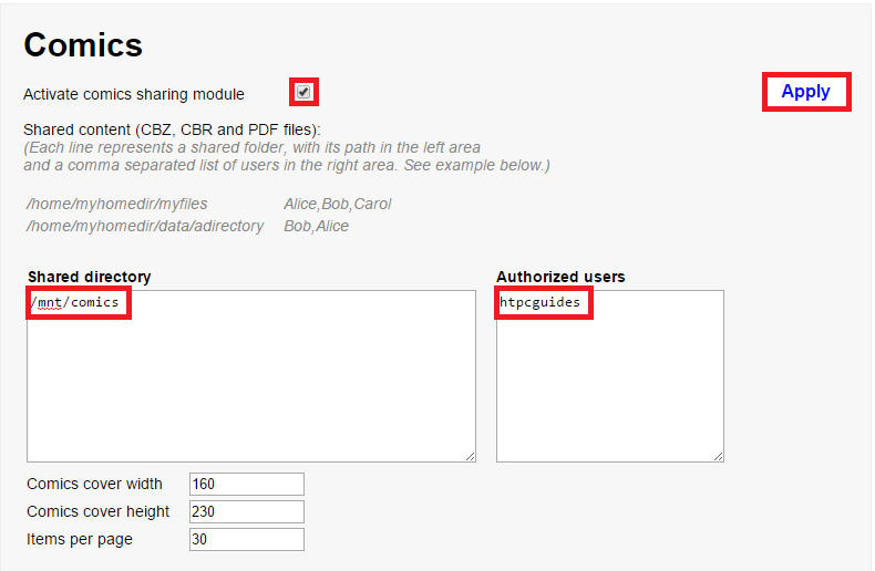 Manually type the Comics location under Shared directory and add the user under Authorized users