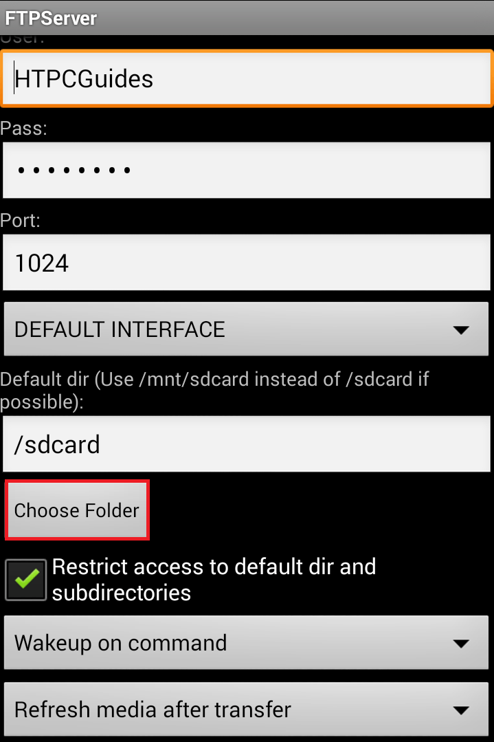 Browse to the default directory by clicking Choose Folder, I have chosen the sdcard.