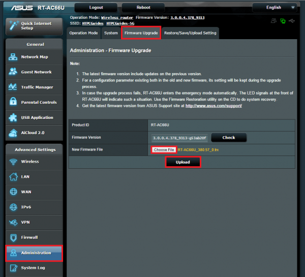 Click Choose File and find the custom asus-firmware.trx file