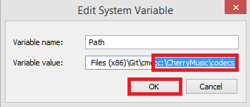 Under Variable value scroll all the way to the right and, without adding a space after the existing last character, add ;c:\CherryMusic\codecs and click OK.