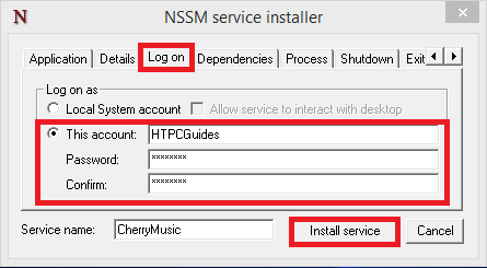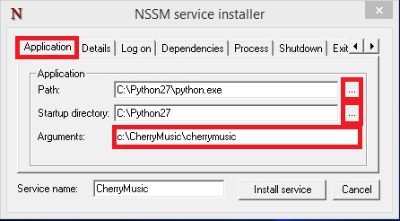 nssm install CherryMusicYou will see this window, under Application for Path browse to C:\Python27\python.exe