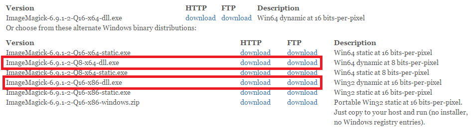 For 32-bit systems the filename is ImageMagick-6.9.1-2-Q16-x86-dll.exe for 64-bit though any version should work.