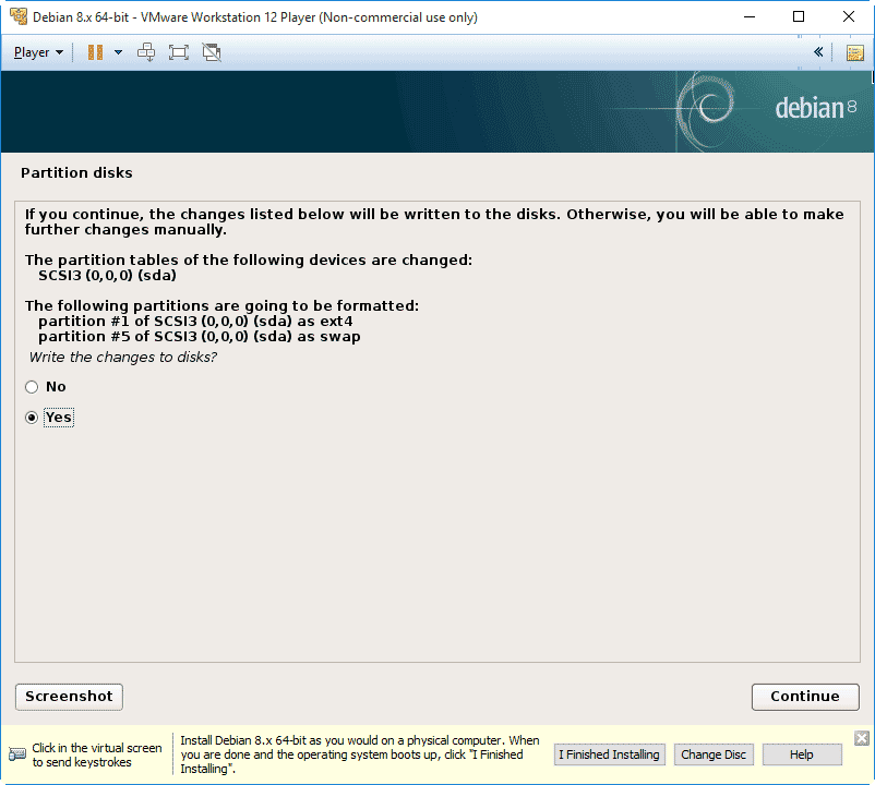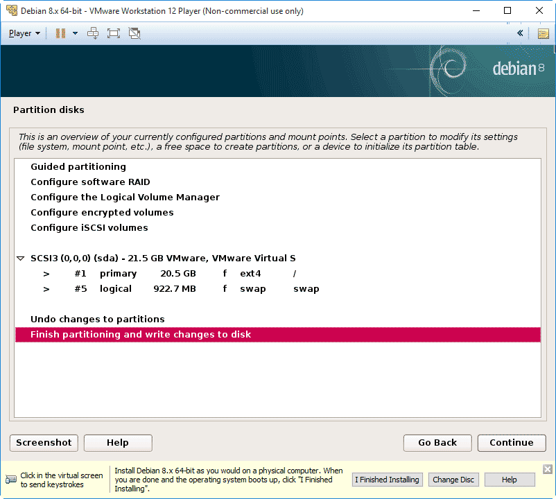 To finish writing the partition changes to the virtual disk choose Finish partitioning and write changes to disk