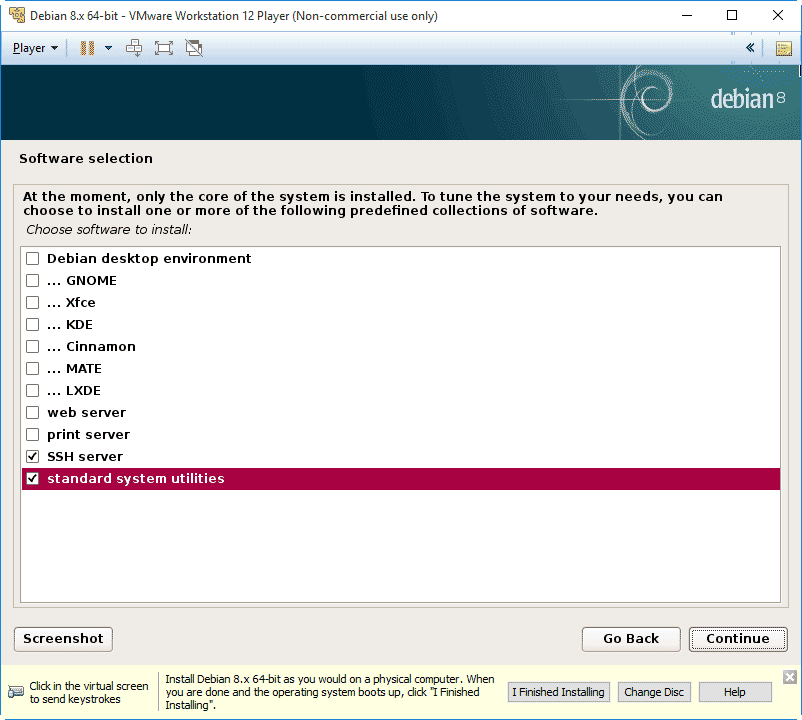 Now that the Debian base system is installed on your virtual machine you can choose some optional packages. I always choose SSH server and standard system utilities.