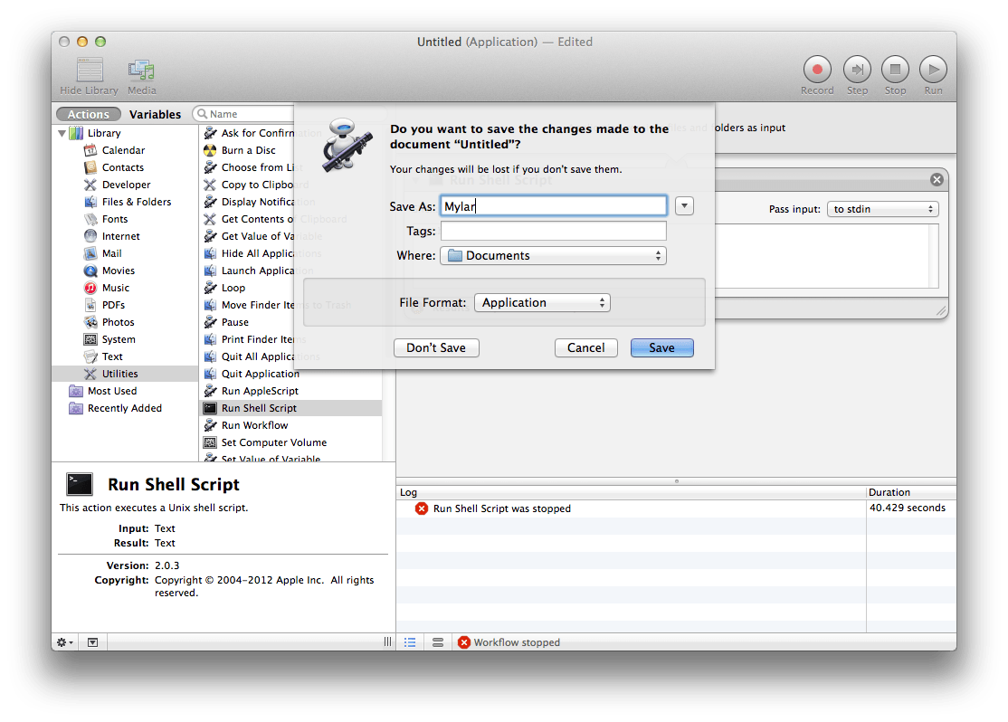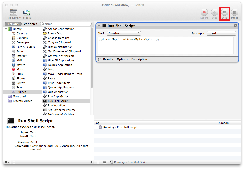 python /Applications/Mylar/Mylar.pyMylar should pop up in Safari, back in Automator click Stop and then close.