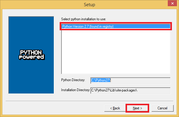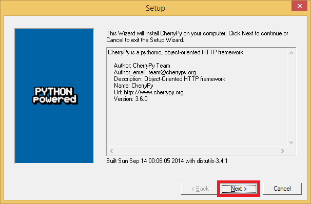 If you installed the correct Python (32 or 64 bit version) then CherryPy will detect it in the registry. This was all automatically selected so just click Next.