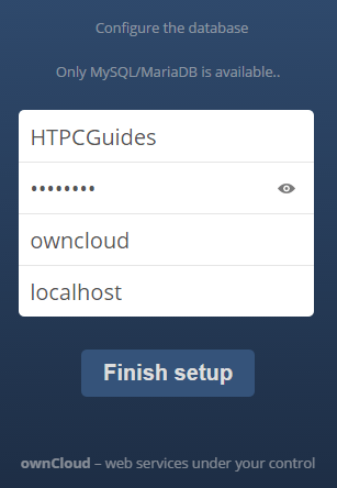 sudo chown -R www-data /mnt/usbstorage/owncloud/tmpBrowse to either your local IP https://ip.address/owncloud or your remote address https://dynamicdns.com/owncloud