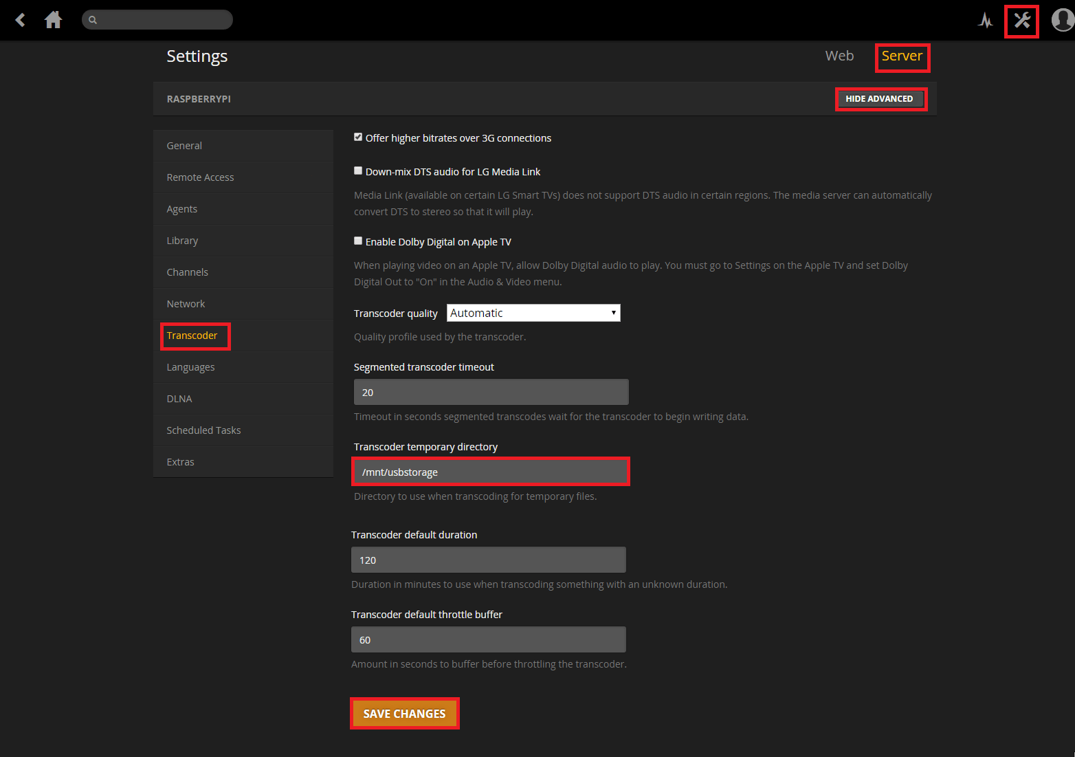 Scroll down to Transcoder temporary directory and set your USB external drive’s mount path (e.g. /mnt/usbstorage not /dev/sda1)