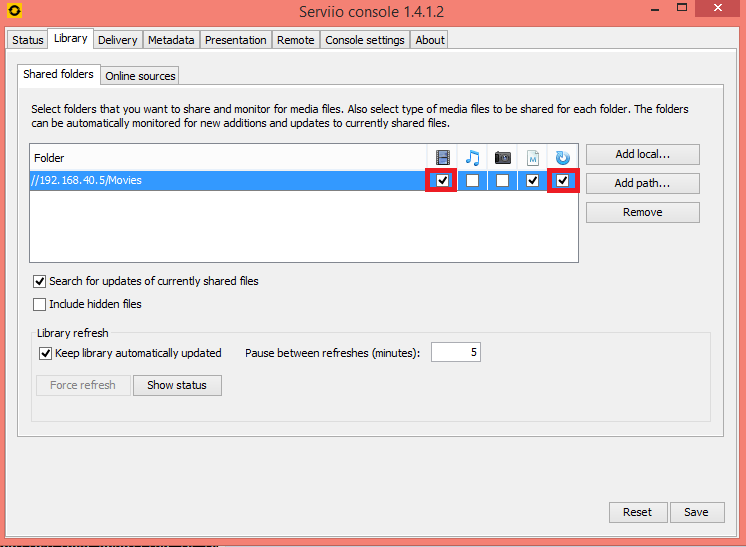 Since the media folder contains movies, I checked the movie box and the refresh box so as your collection grows Serviio updates the library.