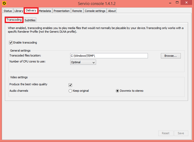 Now click the Delivery tab and then the Transcoding tab. Make sure Enable Transcoding is checked.