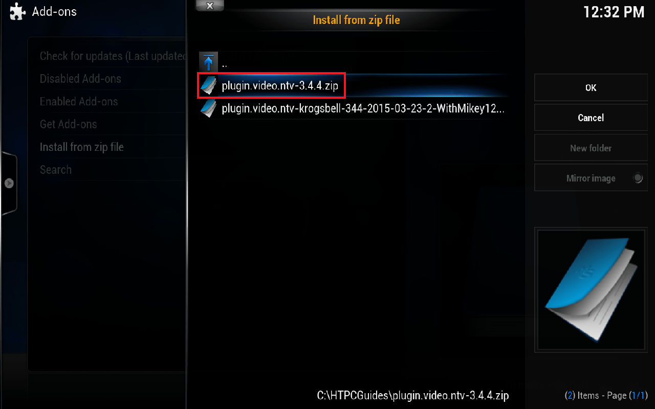 Now browse to the location and choose plugin.video.ntv-3.4.4.zip (or choose the krogsbell one for recording) and click or press Enter