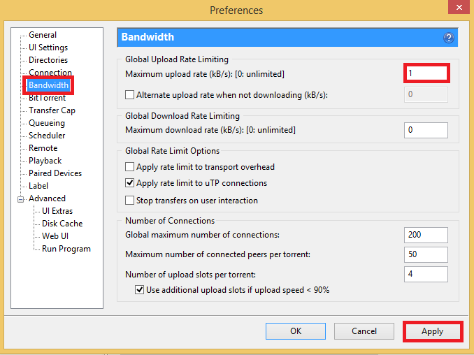 Go back into Preferences and click Bandwidth. Set your Maximum upload to 1 if you don’t want to share at all or a number of your choice if you are feeling generous and can spare the bandwidth.