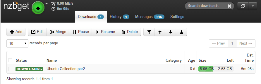 The Raspberry Pi and NZBGet maxed out at 2.9 MB/s without SSL using default settings when downloading from usenet
