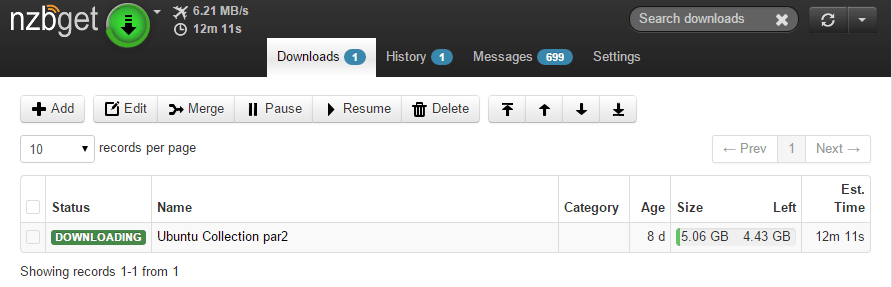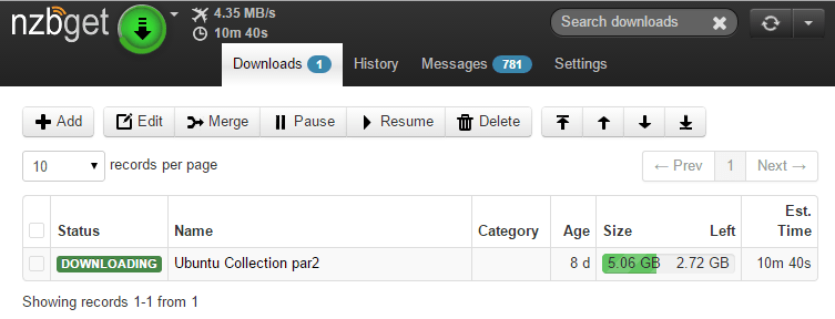 The Raspberry Pi and NZBGet maxed out at 3.35 MB/s with SSL and with performance tweaks when downloading from usenet