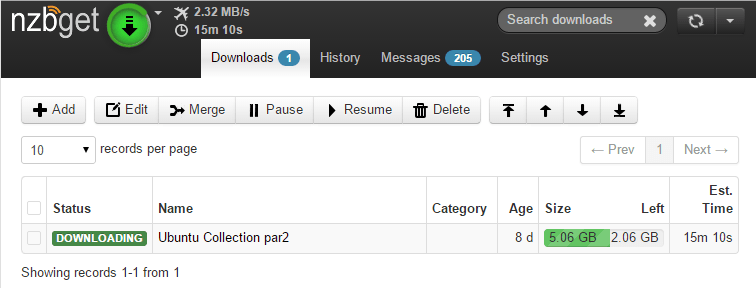 The Raspberry Pi and NZBGet maxed out at 2.32 MB/s with SSL using default settings when downloading from usenet