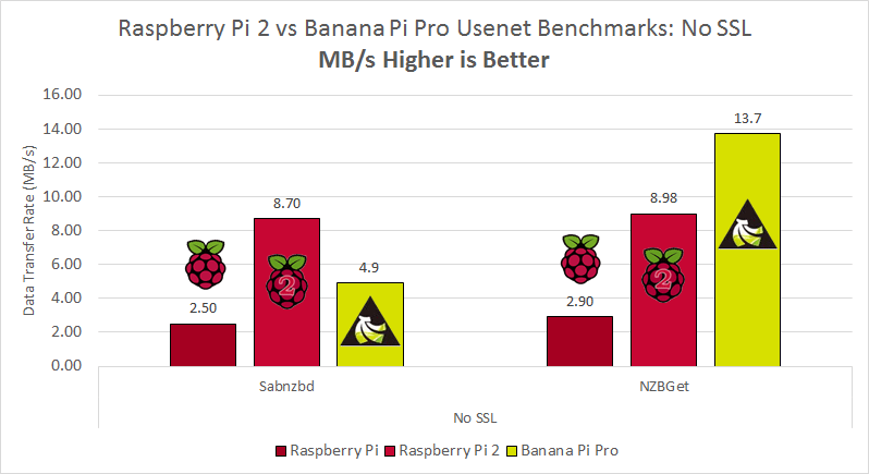 Here is a summary of the Raspberry Pi vs Pi 2 vs Banana Pi usenet downloading benchmarks without SSL.