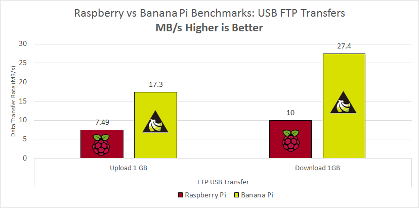 Uploading via FTP to the Raspberry Pi measured 7.48 MB/s while the Banana Pi yielded 17.3 MB/s making the Banana Pi 2.3x faster if you are uploading data via FTP.