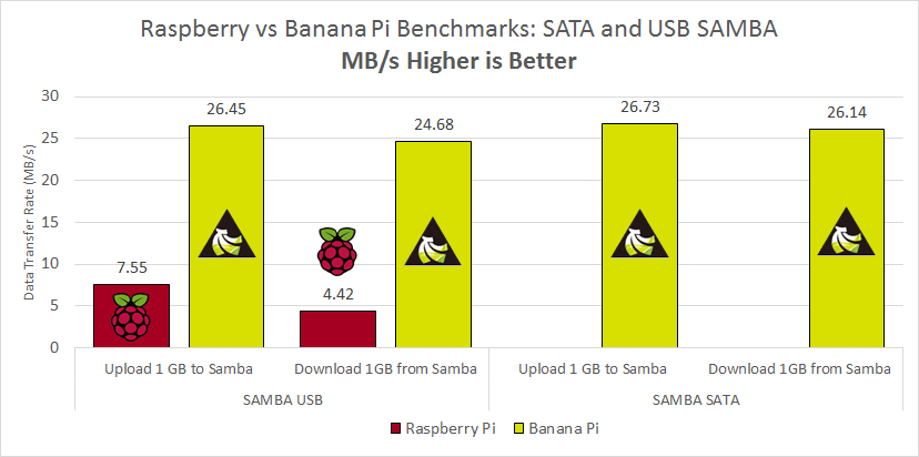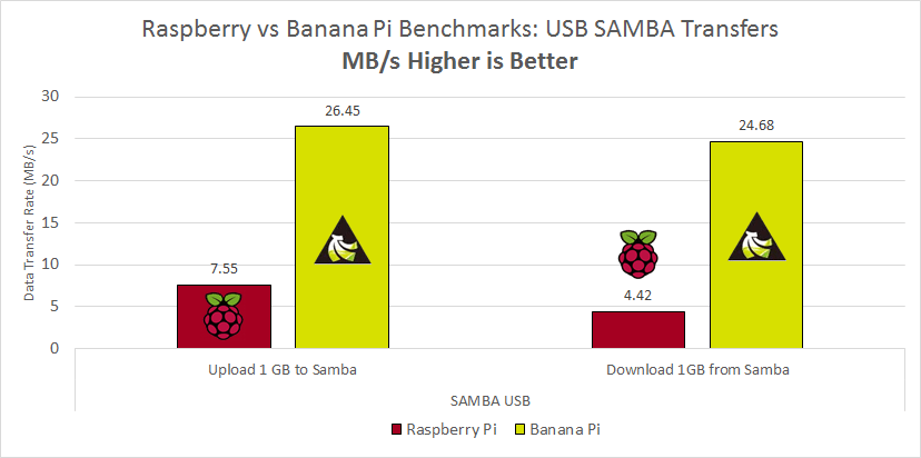 I created a SAMBA share on the Banana and Raspberry Pi which contained the mounted USB external drive. In the download test, the 1GB.zip was copied from the SAMBA share to the Windows machine. For the upload test the same file was copied to the SAMBA share. Robocopy was used on a Windows machine to gather the time and transfer rate.