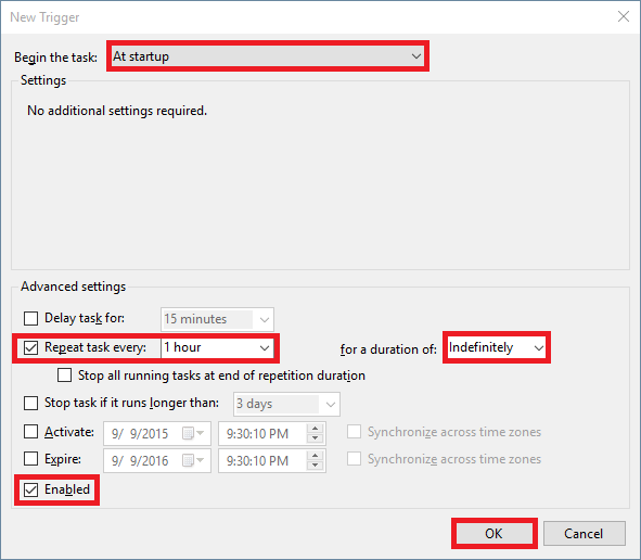 Check Repeat task every: and choose 1 hour to make sure the route is always up to date for a duration of Indefinitely