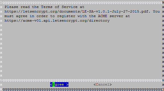 Next prompt will be the Let’s Encrypt Subscribe Agreement. Read it if you feel like, but obviously you must select Agree to proceed