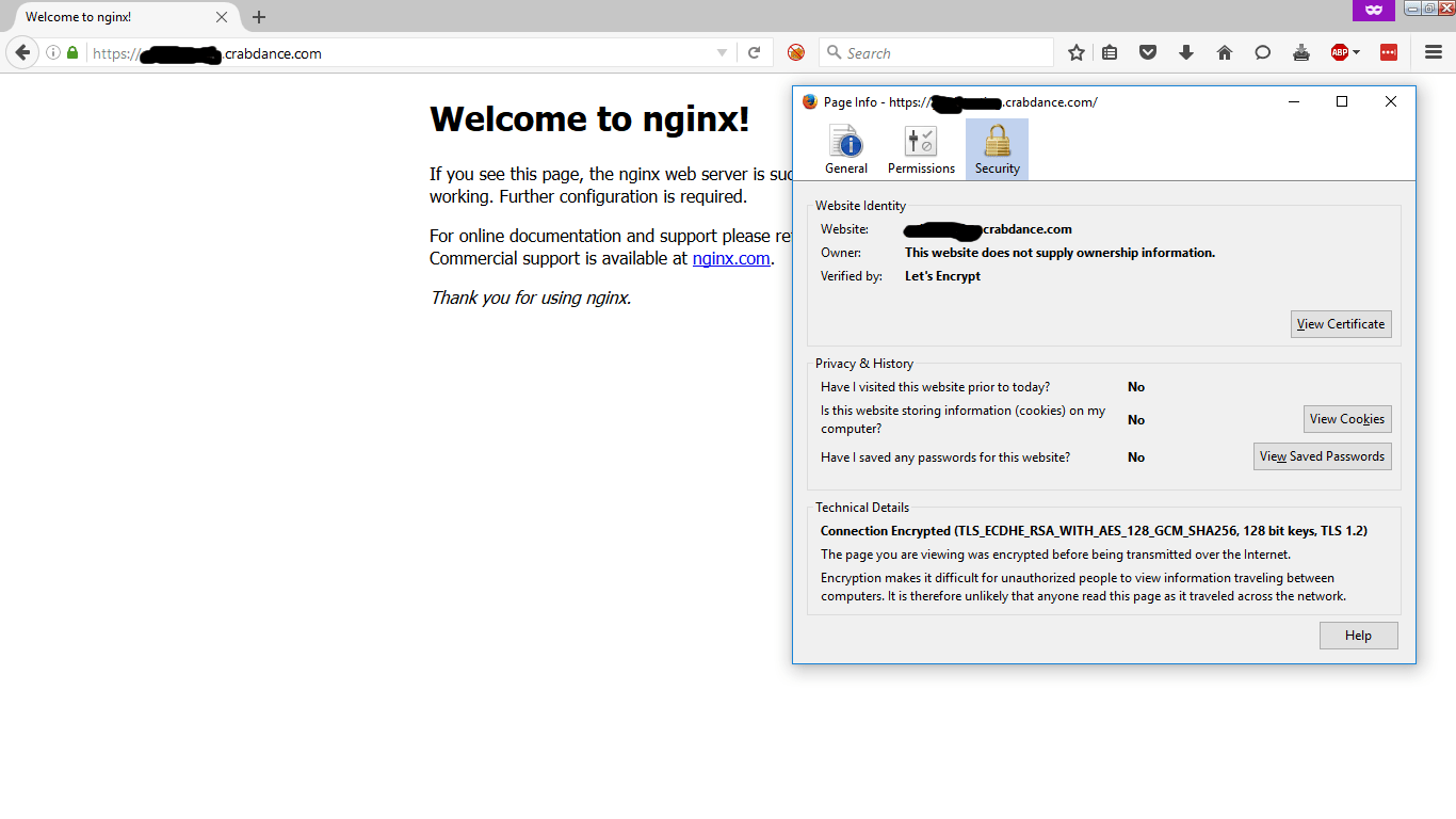 You should see the default nginx page. The important part is the green lock symbol in the address bar, it means that you are connected to your server over https and the certificates are valid! You can check the Page Info by clicking the green lock symbol, then More Information (if using Firefox).