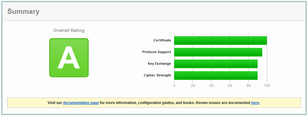 - Configure a strong SSL configuration that will get at least an “A” overall Rating on the Quallys SSL Labs Server Test