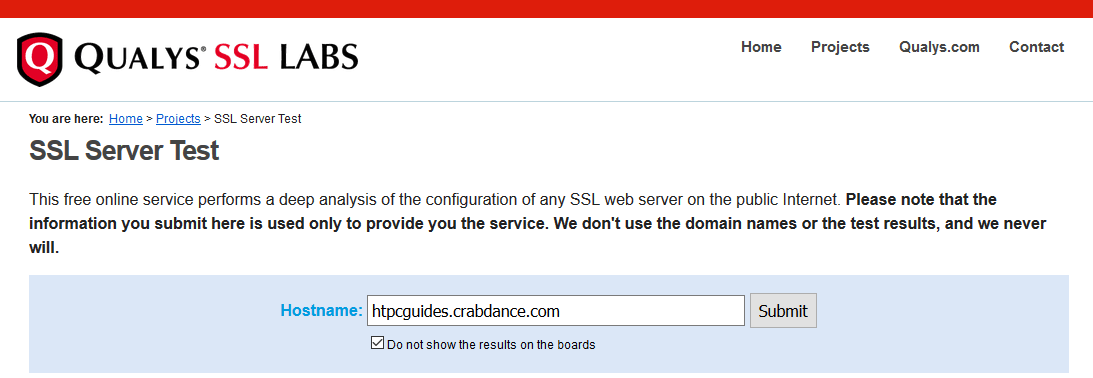 To test your nginx web server, open Qually Labs SSL Test in your browser, and enter the dynamic DNS address of your server in the Hostname field. If you don’t want to show results on boards, tick the Do not show the results on the boards option, then click Submit.